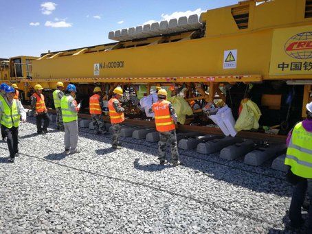 6月1日上午,位于山西天鎮(zhèn)火車站的大張高鐵施工現(xiàn)場,鋪軌機將首對500米長軌安全平穩(wěn)地鋪設(shè)