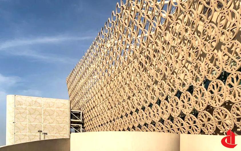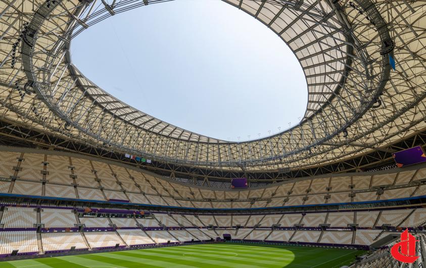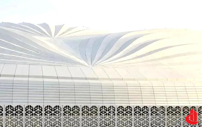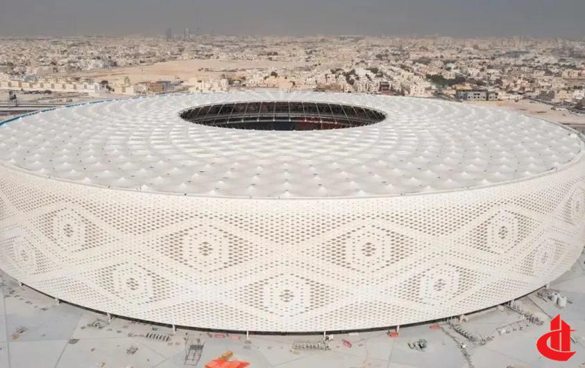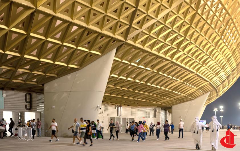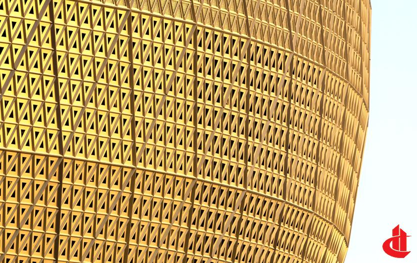 盧賽爾球場(chǎng)是本屆世界杯的主球場(chǎng),可同時(shí)容納8萬(wàn)名觀眾。該場(chǎng)館由Foster + Partners操刀,以伊斯蘭椰棗碗和琺瑯燈籠為靈感,將球場(chǎng)外觀設(shè)計(jì)為一個(gè)在陽(yáng)光下閃閃發(fā)光的金色碗狀容器。立面具有三角形開(kāi)口,在視覺(jué)上通過(guò)斜交網(wǎng)格強(qiáng)調(diào)了碗的結(jié)構(gòu),形成了一個(gè)穿孔的屏障,為內(nèi)部大廳提供了陰涼和過(guò)濾后的斑駁光線。