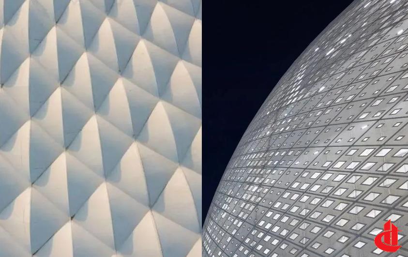 阿圖瑪瑪球場(chǎng)由阿曼建筑師Ibrahim M Jaidah設(shè)計(jì)。球場(chǎng)的外觀設(shè)計(jì)構(gòu)思來(lái)自“gahfiya”,一種阿拉伯男子穿戴的傳統(tǒng)編織帽,這也是設(shè)計(jì)師對(duì)阿拉伯傳統(tǒng)文化的贊美。球場(chǎng)的平面呈圓形,外立面由帶孔的白色板組成,模仿菱形的編織圖案。從上空俯視,其亮麗的白色外觀在郁郁蔥蔥的環(huán)境中顯得格外醒目。