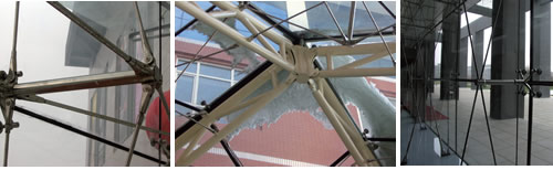 2、點式玻璃幕墻是一種高通透,簡潔明快的幕墻形式,它將玻璃和索桿系統(tǒng)完美的結(jié)合,充分表達建筑設計師的理念。